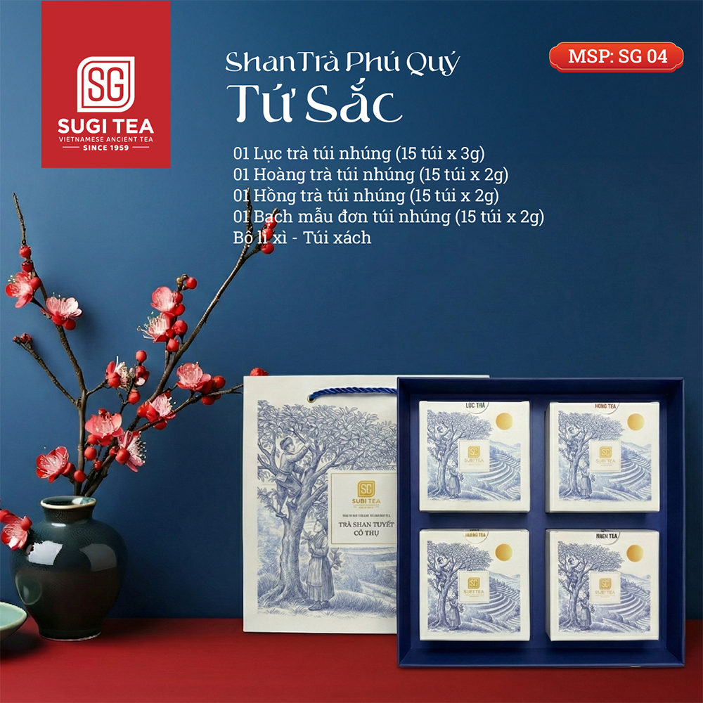Tứ Sắc là sự hội tụ của bốn phẩm trà Shan Tuyết cổ thụ tượng trưng cho bốn mùa an lành và đủ đầy.Tứ Sắc là sự hội tụ của bốn phẩm trà Shan Tuyết cổ thụ tượng trưng cho bốn mùa an lành và đủ đầy.
